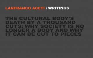 Lanfranco Aceti is an artist, curator, and academic who produces installations, projects in public space, performances, and exhibitions on issues such as social justice, postdemocracy, migration, the climate crisis, forms of resistance, and matriarchal social hypotheses.