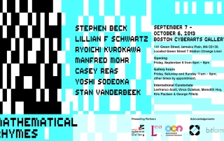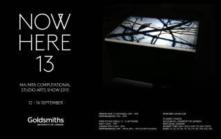 Nowhere 2013: Computational Arts Exhibition. Private view: Thursday 12 September, 6-9pm. Performances: 7-9pm. Open to the public: 13 - 16 September, 10am-7pm (except Sunday 15 September, 10am-4pm). Performance: 2-3pm & 6-7pm (except